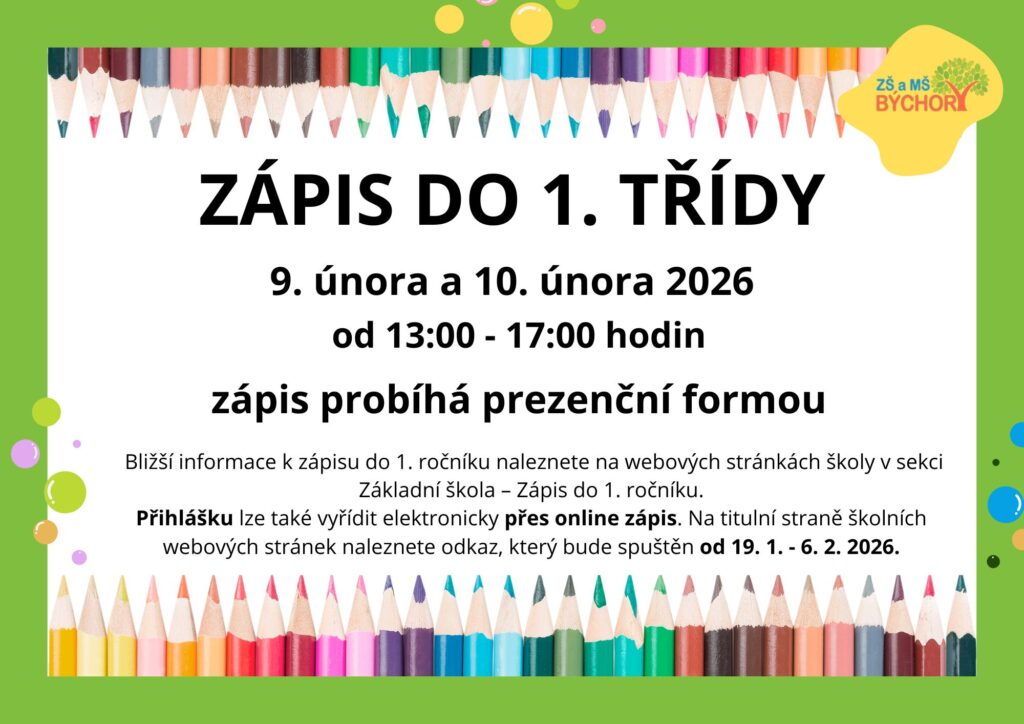 Zápis do 1. třídy / Aktuality MŠ, Aktuality ZŠ / Napsal ZŠMŠ Býchory Vážení rodiče, milé děti,srdečně Vás zveme k zápisu do 1. třídy, který se bude konat 9. a 10. února 2026 v naší škole.Těšíme se na Vás!Informační leták k zápisu do 1.třídy _ke stažení